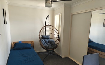 The room I’m looking to rent out is the master bedroom with an ensuite. It has air con, black out blinds, new carpet and a ceiling fan.